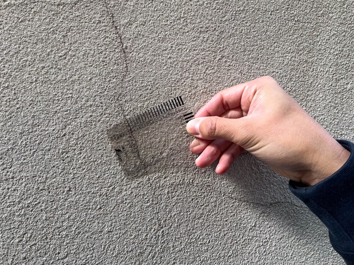 これはクラックスケールといって、ひび割れの幅を測る専用の定規だよ。ホームセンタ-で600~700円くらいで売っているよ!